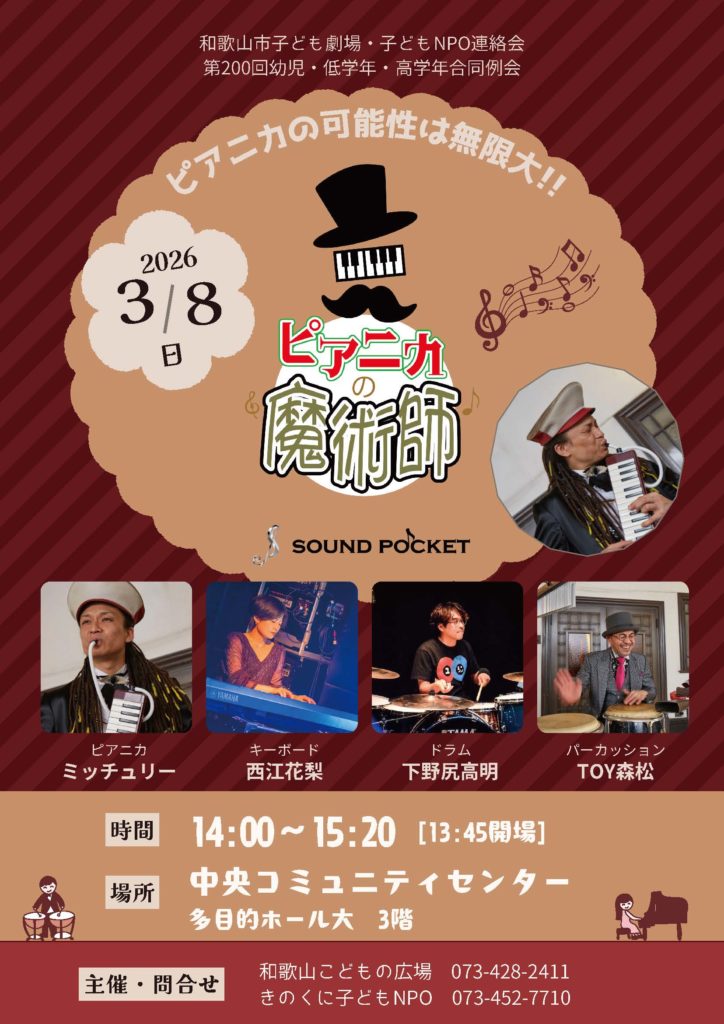 【和歌山】3/8(日)和歌山市子ども劇場・子どもNPO連絡会主催「ピアニカの魔術師コンサート」
