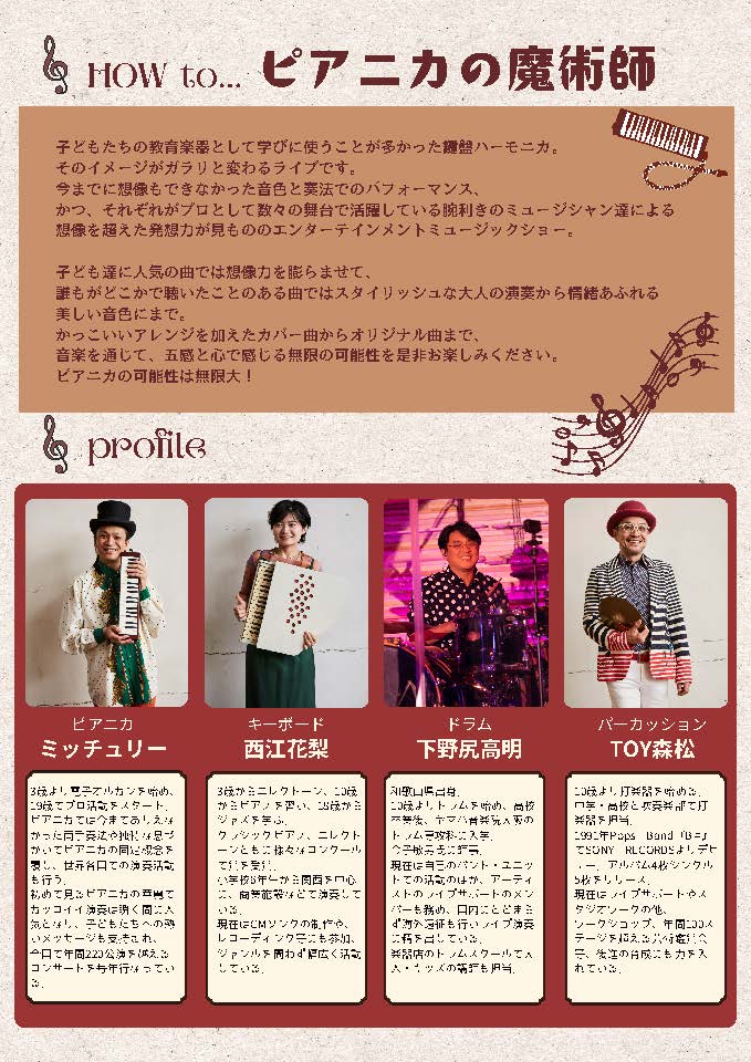 ピアニカの魔術師 公式ウェブサイトへようこそ!私たちは音楽を通じて子どもたちの大きな夢と無限大の可能性をサポートし続けます。